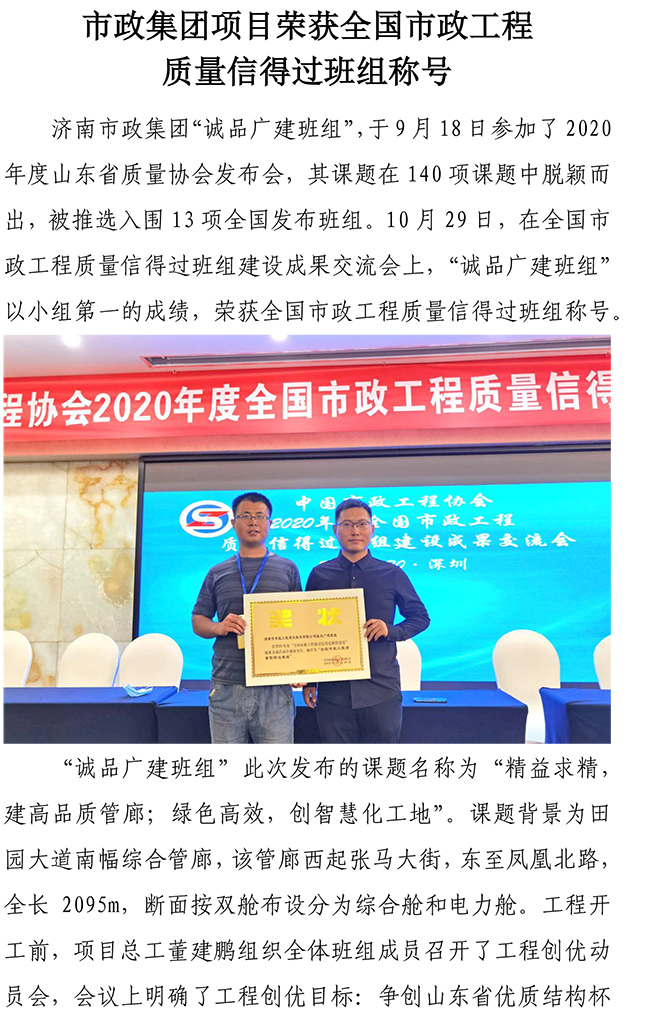 濟南市政集團項目榮獲全國市政工程質(zhì)量信得過班組稱號