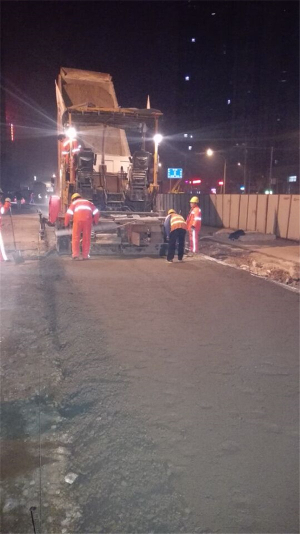 慢車道進行水穩攤鋪施工。